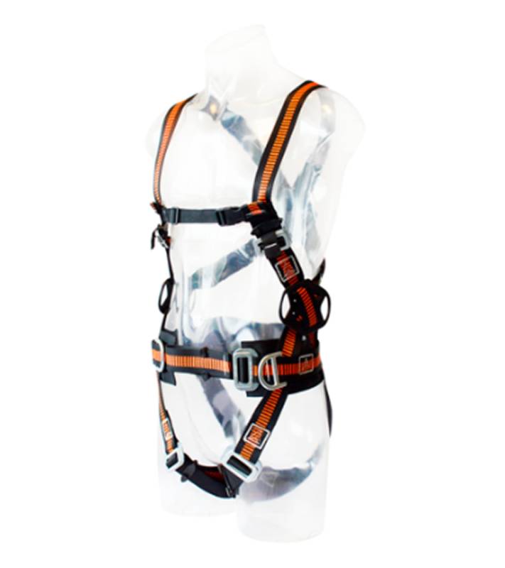 Arnés con 3 puntos de conexión y cintas bicolor para facilitar su colocación. Regulación en hombros, piernas y cintura. Para usuarios ocasionales. Ex WXEHA212.