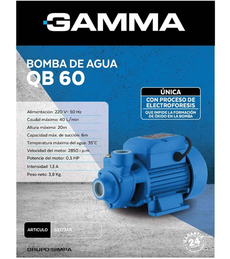 La bomba periférica Gamma QB60 es la solución ideal para quienes buscan eficiencia y rendimiento en el bombeo de agua. Con una potencia de 0.5 hp, esta bomba es capaz de alcanzar una altura máxima de elevación de 22 metros y un caudal máximo de 40 litros por minuto, lo que la convierte en una opción versátil para diversas aplicaciones.