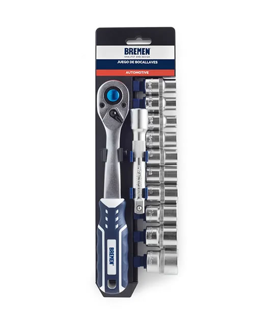 El juego de Bocallaves con Accesorios Portátil de 1/2 BREMEN cuenta con 12 piezas de las cuales incluye, 10 bocallaves hexagonales de encastre de 1/2" de diferentes medidas + 1 Llave crique + 1 Barra de extensión.